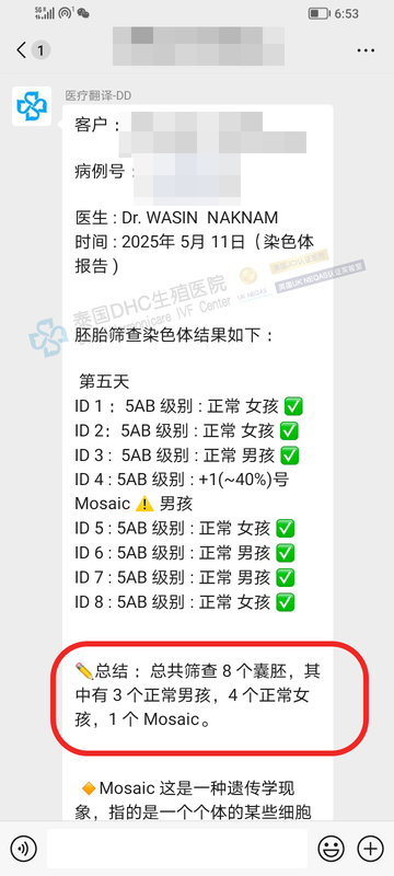 恭喜客戶 11枚囊胚→優(yōu)選8枚送篩→喜提3男4女健康胚胎