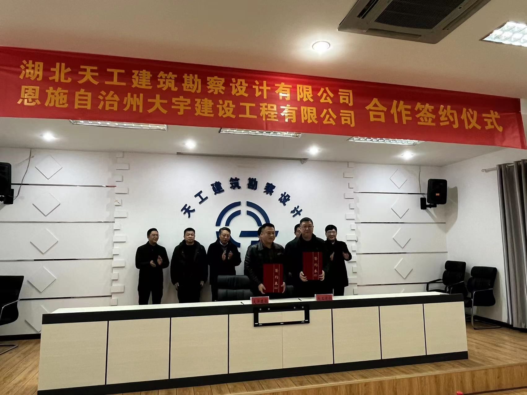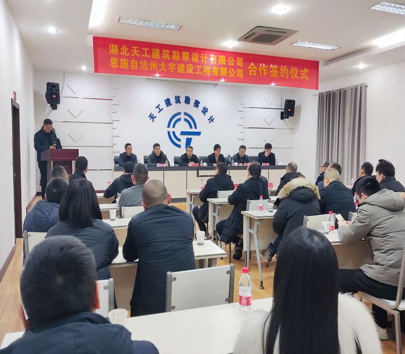2024年1月18日(農(nóng)歷臘月初八)下午,湖北天工建筑勘察設(shè)計(jì)有限公司與恩施自治州大宇建設(shè)有限公司合作簽約儀式在恩施市清江東路2號(hào)“天工設(shè)計(jì)”五樓會(huì)議室舉行。恩施州住建局黨組成員、副局長(zhǎng)袁燕奇,恩施州住建局黨組成員、總工胡平,恩施職業(yè)技術(shù)學(xué)院建筑工程學(xué)院院長(zhǎng)雷元?jiǎng)P,恩施州建筑業(yè)協(xié)會(huì)會(huì)長(zhǎng)王保榮等領(lǐng)導(dǎo)出席了會(huì)議。湖北天工建筑勘察設(shè)計(jì)有限公司及恩施自治州大宇建設(shè)公司相關(guān)負(fù)責(zé)人及社會(huì)各界人士參加了會(huì)議。