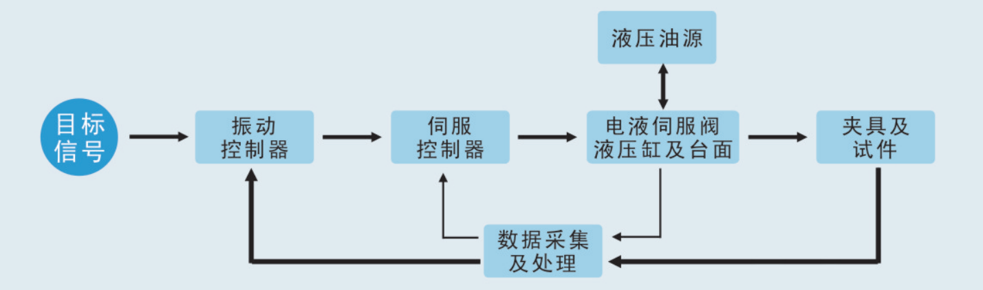 液壓振動(dòng)試驗(yàn)系統(tǒng)的主要工作原理是采用可控制的電液伺服閥,通過調(diào)節(jié)液壓油的壓力使作動(dòng)裝置產(chǎn)生往復(fù)振動(dòng)。輸入的電控信號(hào)經(jīng)放大器進(jìn)入伺服閥,伺服閥將與輸入信號(hào)成比例的液壓油輸入液壓缸,以驅(qū)動(dòng)活塞并帶動(dòng)臺(tái)面運(yùn)動(dòng)。液壓振動(dòng)試驗(yàn)系統(tǒng)能產(chǎn)生較大的推力和位移,并且在低頻的時(shí)候也可以提供較大的激振力。